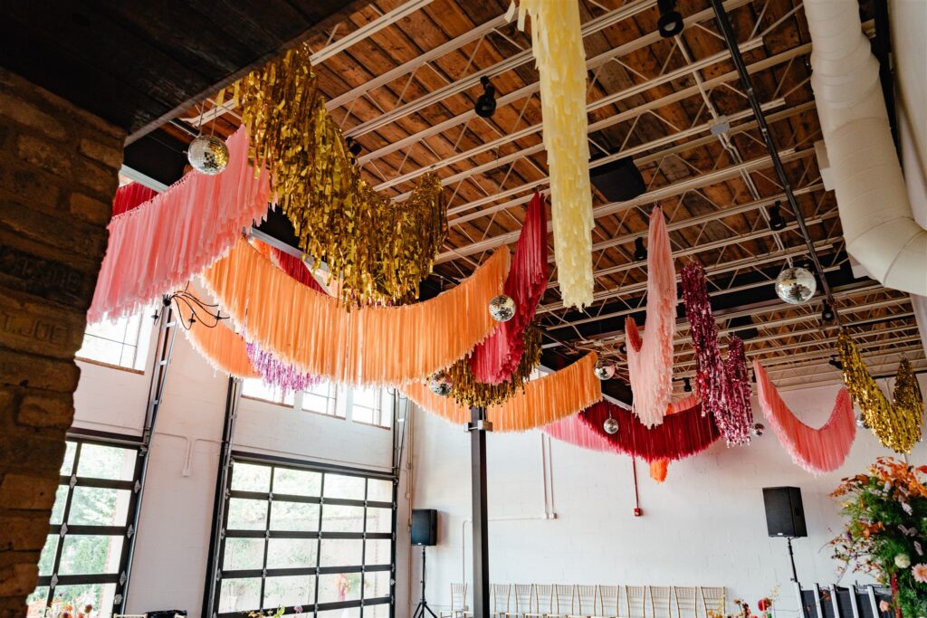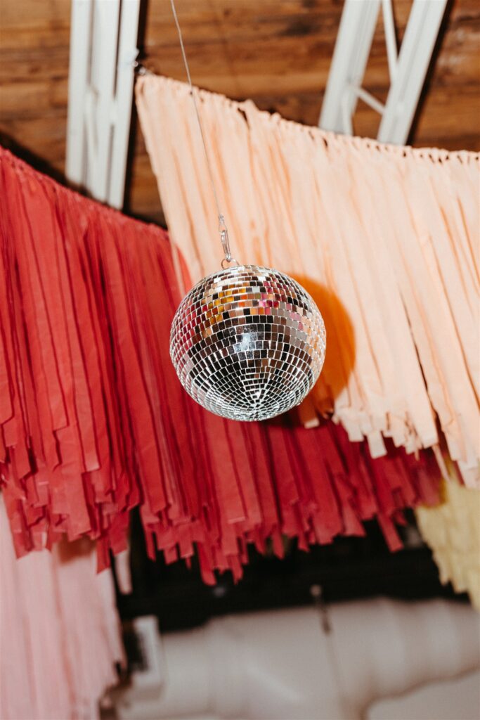 Bright pink and orange ceiling installations floated above the reception space. Disco balls caught the light. Citrus details layered the tables alongside colorful candles and bold florals by Poppy and Snail. Their invitations featured green and orange florals, which tied everything together from paper to party.