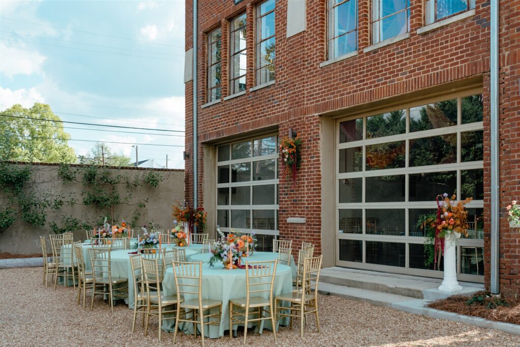 Inside, you will find exposed brick, high ceilings, and large garage style doors that open to the courtyard. The natural light alone is reason enough to love it. The space includes a built in bar, access to a catering kitchen, and several included amenities. They provide round tables and gold Chiavari chairs, but they also maintain an open vendor policy if that’s more your speed (with a licensed caterer requirement.)